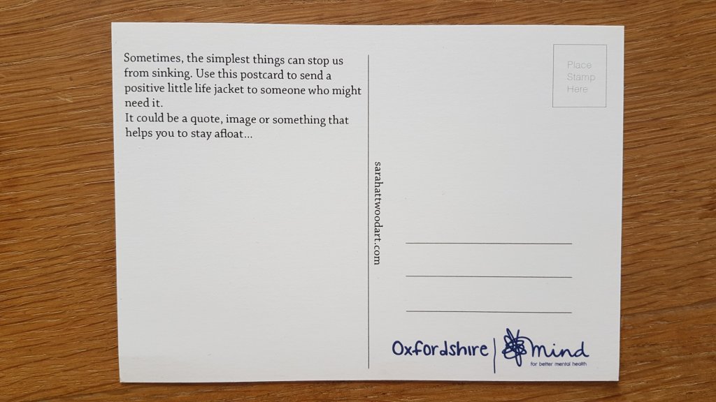 I’ve been a mental health advocate for a long time and have created Little Life Jackets postcards in conjunction with Oxfordshire Mind. The smallest message, sign of hope or image can help someone from sinking, and these cards are designed to encourage you to get in touch with someone who might need a lift.